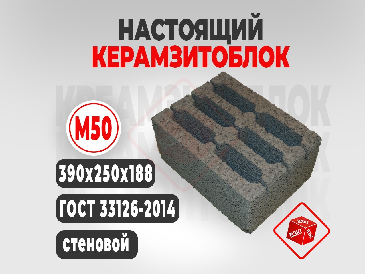 Керамзитоблок 390x250x188 М50 (6 пустотный)